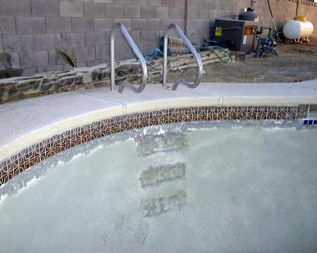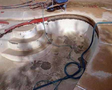 This is the story of a pool redo where the plaster had been coated with an epoxy/fiberglass type of coating that had failed.