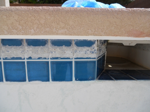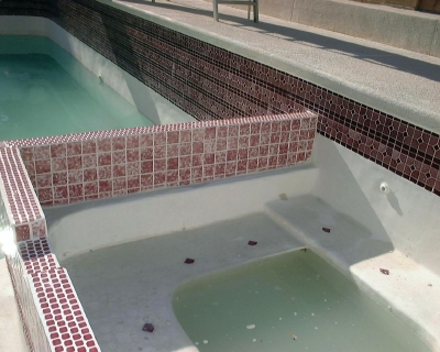 The coating was delaminated, had blisters and voids. When exposed, it pealed off in sheets. The tiles and light fixture were replaced at the same time.